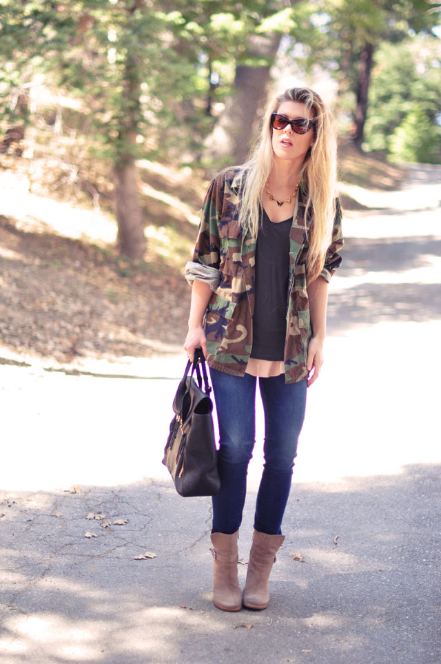 For a casual street look that is especially suitable to wear in the fall, you can wear a camo jacket with a grey v neck t shirt, skinny jeans and ankle boots. For more outfit ideas of similar shoes, you can check out our blog post on combat boots.