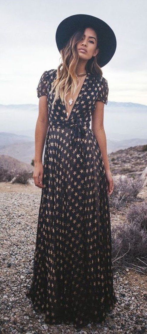To form this artistic and attractive outfit, you can wear a short sleeve black and pink star-printed maxi shift dress as the focal point of your outfit. Pair it with a pair of black heeled sandals. Now, add a black felt hat into the mix to provide that nifty artistic touch that can separate you from the crowd.