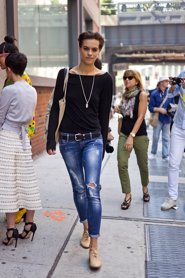 For a chic street outfit that is especially suited for the fall, wear a white t shirt with black skinny jeans. Pair them with oxford shoes and most importantly a stylish denim jacket.